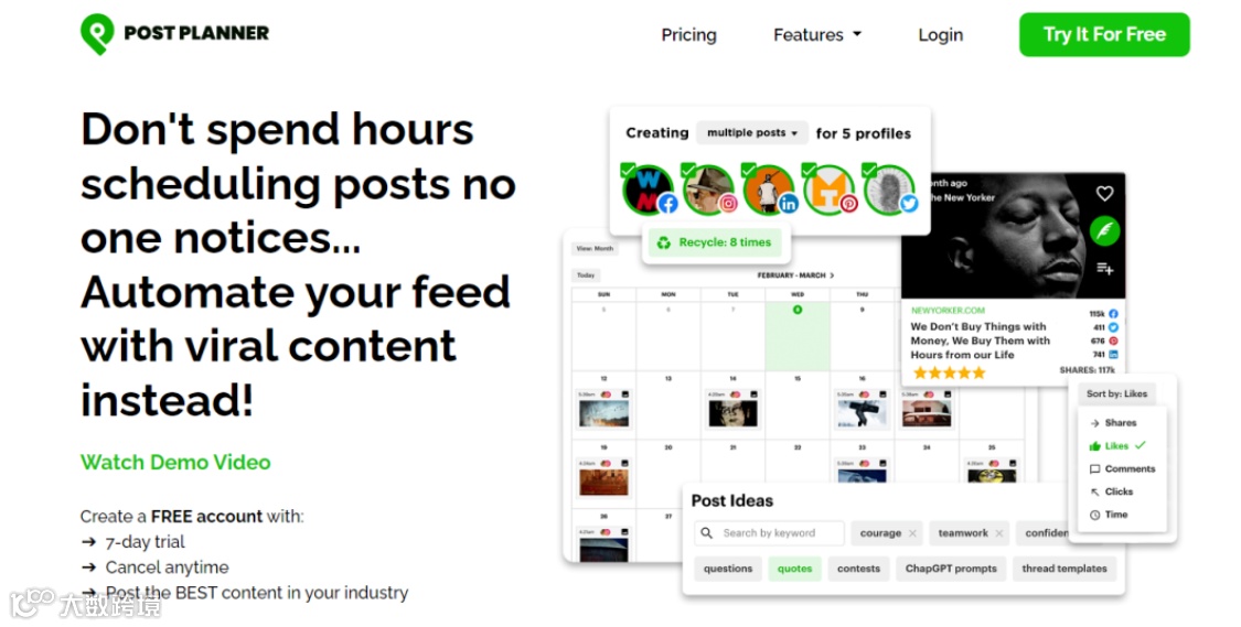 PostPlanner是一款能在社交媒体上寻找内容再分享的工具,帮助卖家查找并发布与所在行业相关的最佳内容。
