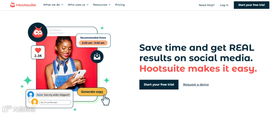 Hootsuite是管理社交网络和博文的工具,可管理多个社交媒体账户。具备监控工具以及集成功能,可以帮助您计划和发布内容、跟踪帖子、分析内容质量等。