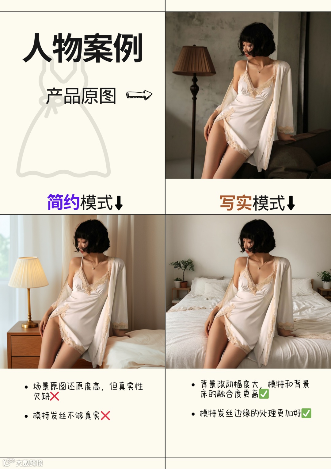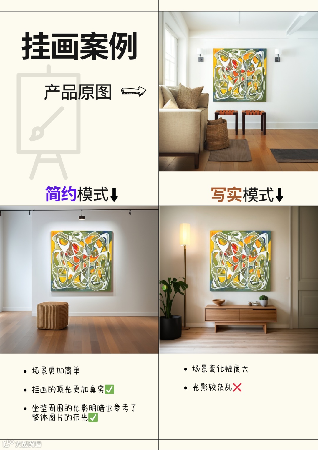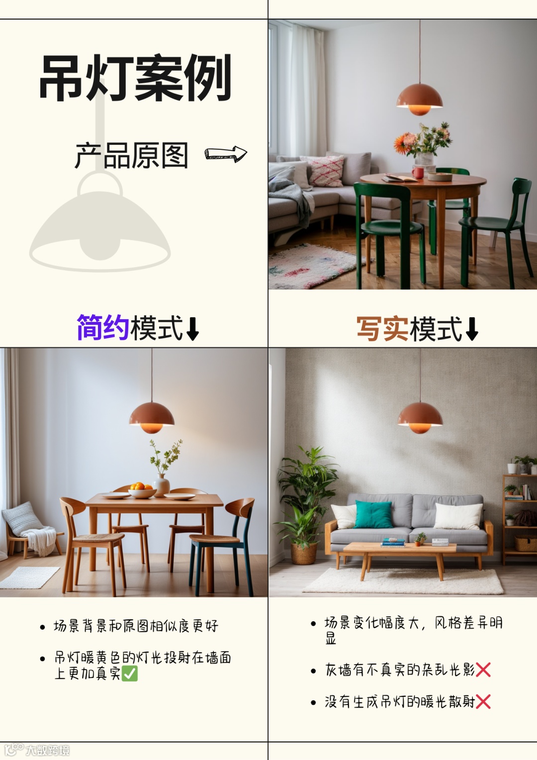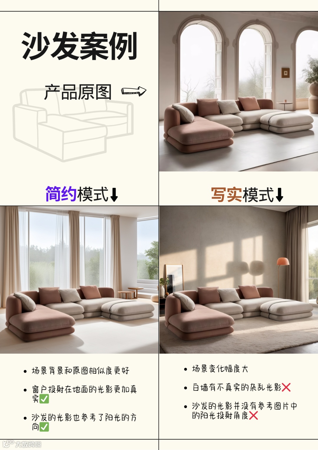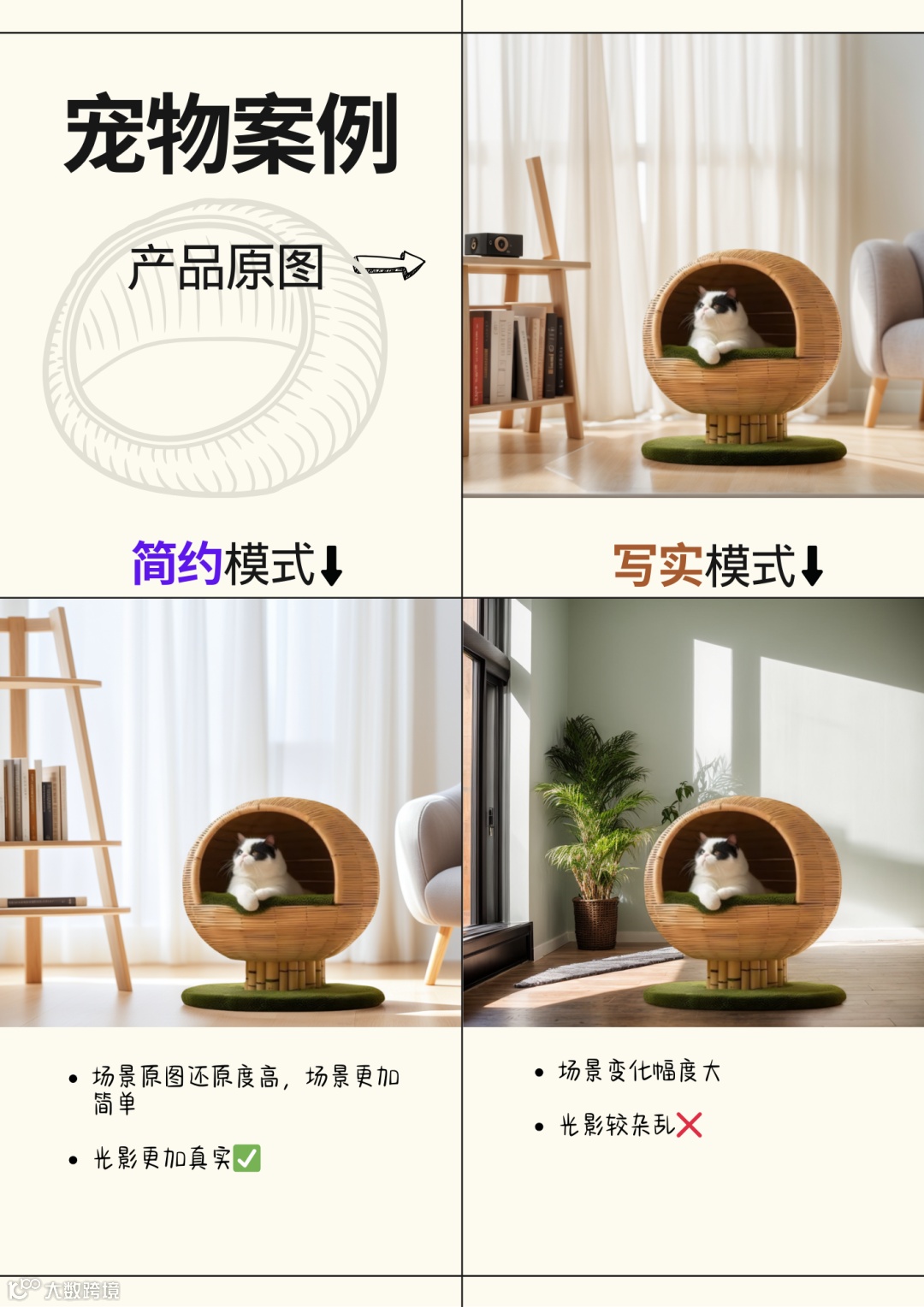 全新「简约模式」上线,光影效果更加真实,优化了商品悬空、多补问题,1张原图图轻松裂变20+套场景图。不用🚫复杂prompt指令,只需轻松拖动背景相似度就能批量生成高质感场景图!