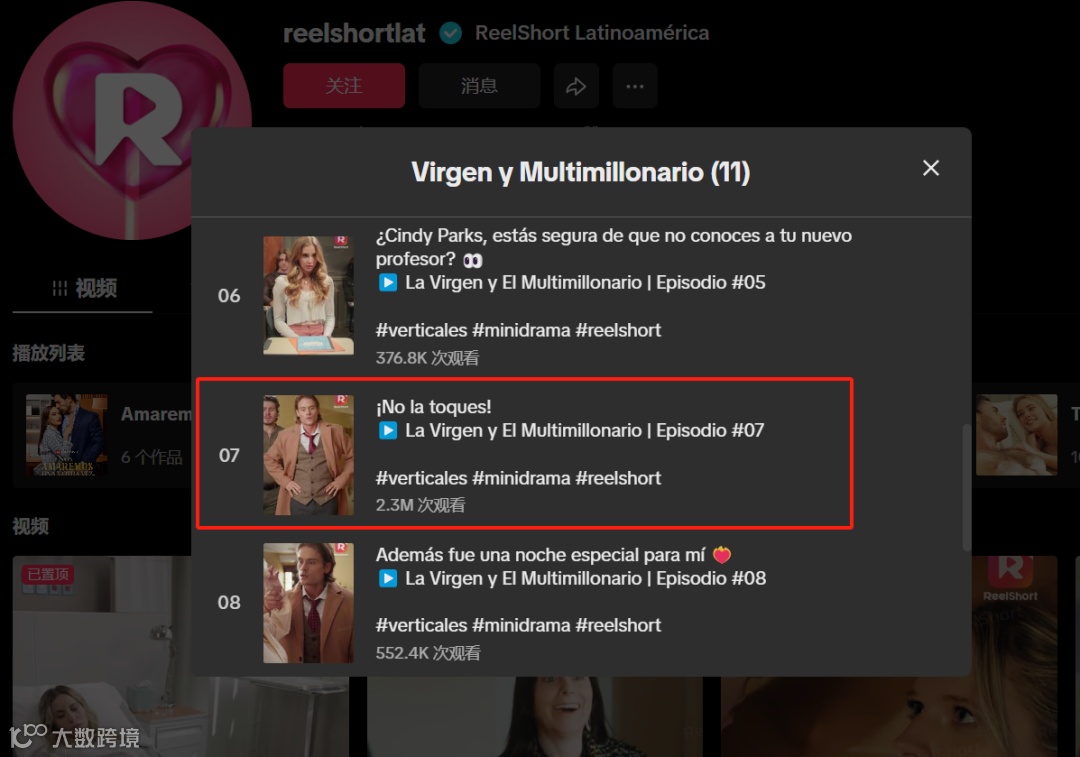 目前,ReelShort的主账号@reelshortapp 累计粉丝量160万,点赞量1530万,在其Series区域的作品观看量大多在万级到十万级;关联账号@reelshortlat的Series区域作品,有单集短剧观看量高达230万。