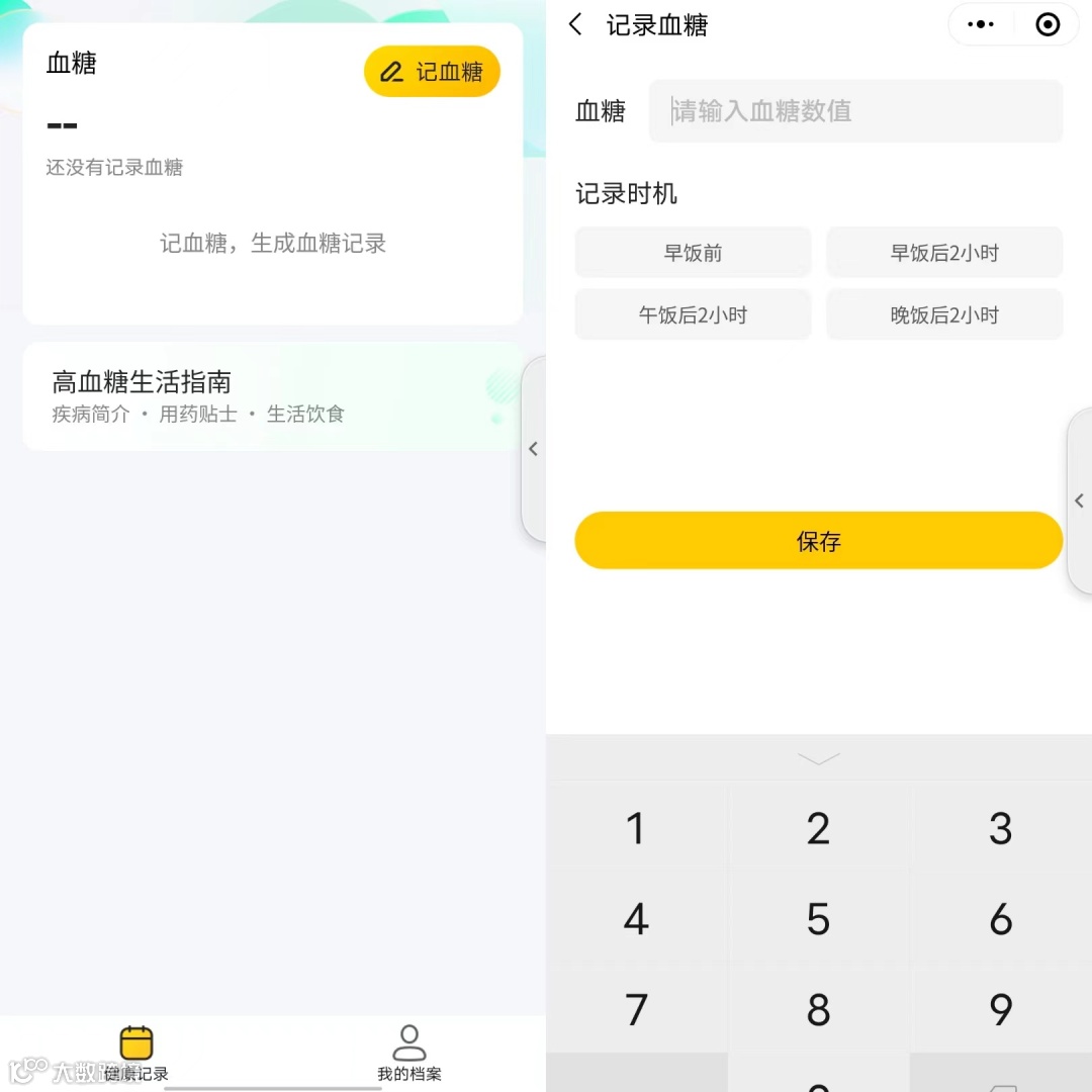 根据体验,这款小程序主要用于记录用户每天的血糖值,精确到早饭前、早饭后2小时、午饭后2小时和晚饭后2小时。记录的血糖值会生成记录,并在一周过后,再次生成每周档案存于个人档案中。