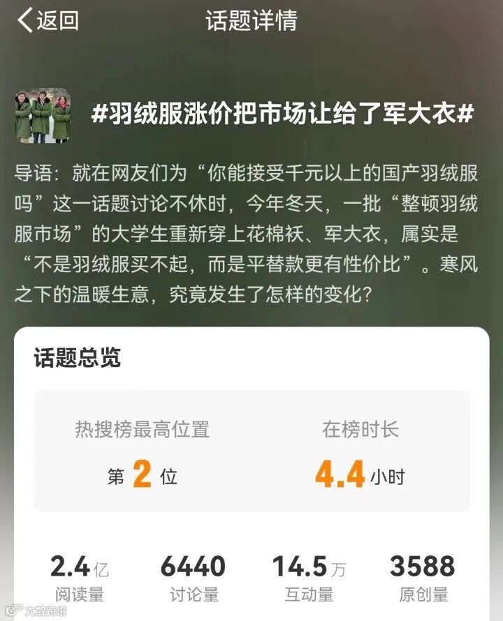这种情况下,网友感叹“不断涨价的羽绒服,把市场让给了军大衣”也就不足为奇了。