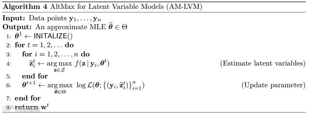 算法 4 概括了 gAM 对潜在变量学习问题的适应性。注意,算法中的步骤 4 和 6 可以在几个问题上非常有效地执行。