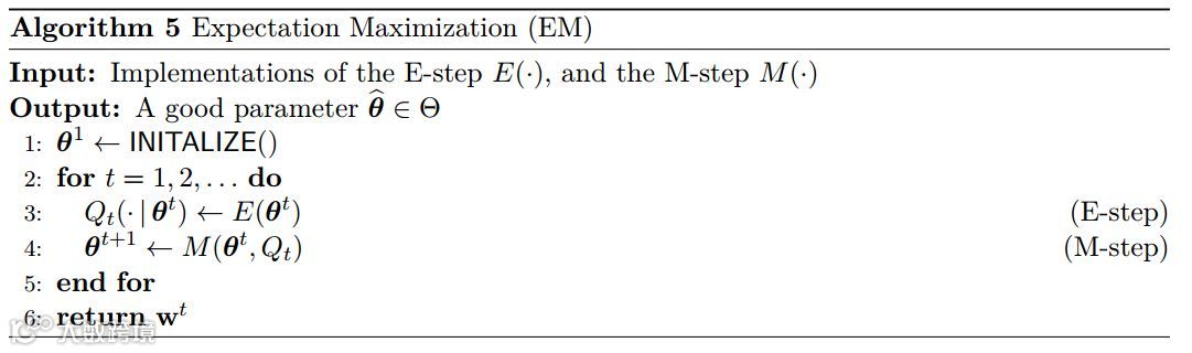 算法 5 给出了 EM 算法的整体框架。实现 EM 算法需要两个过程,其一是构造与当前迭代(期望步骤或 E 步骤)对应的 Q 函数,另一个是用于最大化 Q 函数(最大化步骤或 M 步骤)以获得下一迭代。