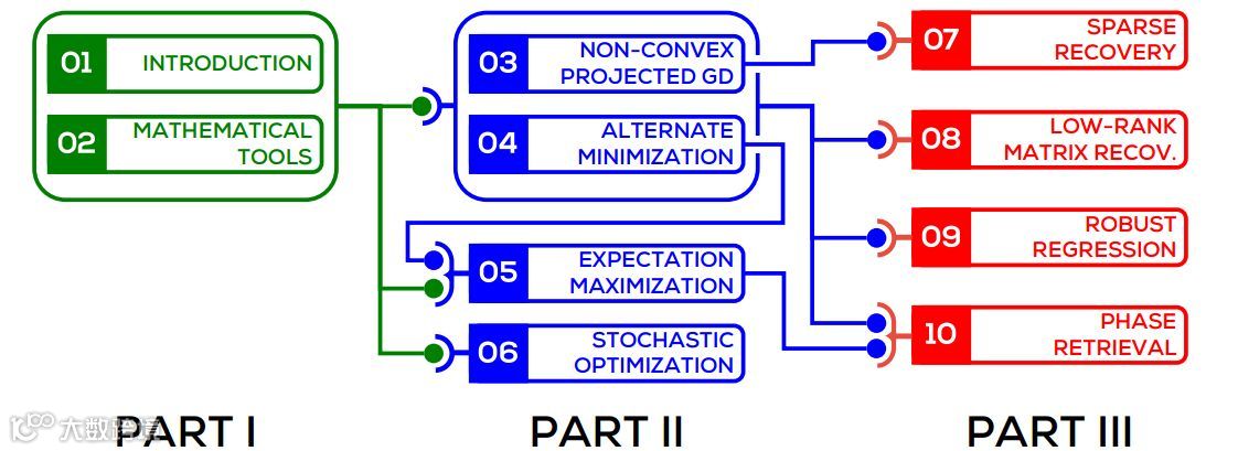 第 3 部分:应用。这部分介绍机器学习和信号处理领域中四个有趣的应用,探索如何使用之前介绍的非凸优化技术解决这些问题。