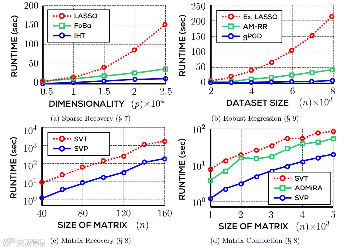 图 1.3:不同方法在四个非凸优化问题上的运行时实验对比。LASSO、extended LASSO 和 SVT 是基于松弛的方法,IHT、gPGD、FoBa、AM-RR、SVP 和 ADMiRA 是非凸方法。在所有情况中,非凸优化技术比基于松弛的方法快出一个数量级。注意图 1.3c 和 1.3d 使用对数尺度的 y 轴。