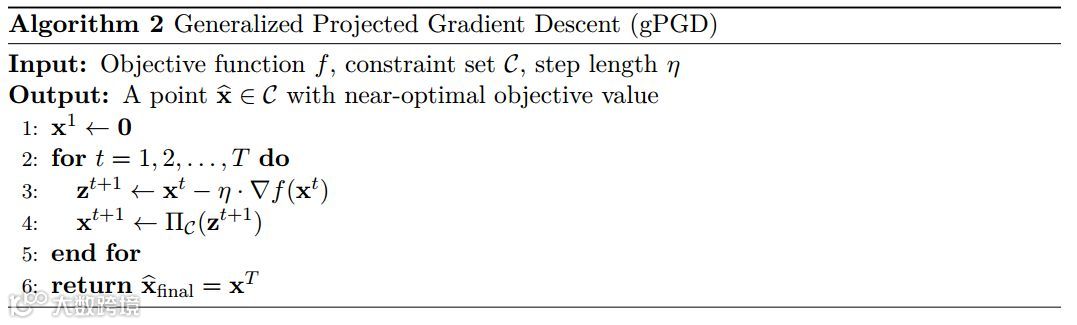 算法 2 概述了用于解决非凸优化问题的广义投影梯度算法(gPGD)的过程。读者将会发现这非常类似于算法 1 之中的 PGD。然而,一个关键的区别是所做的投影:PGD 利用了凸投影,而 gPGD 利用了非凸投影(如果涉及到一个非凸约束集 C)。