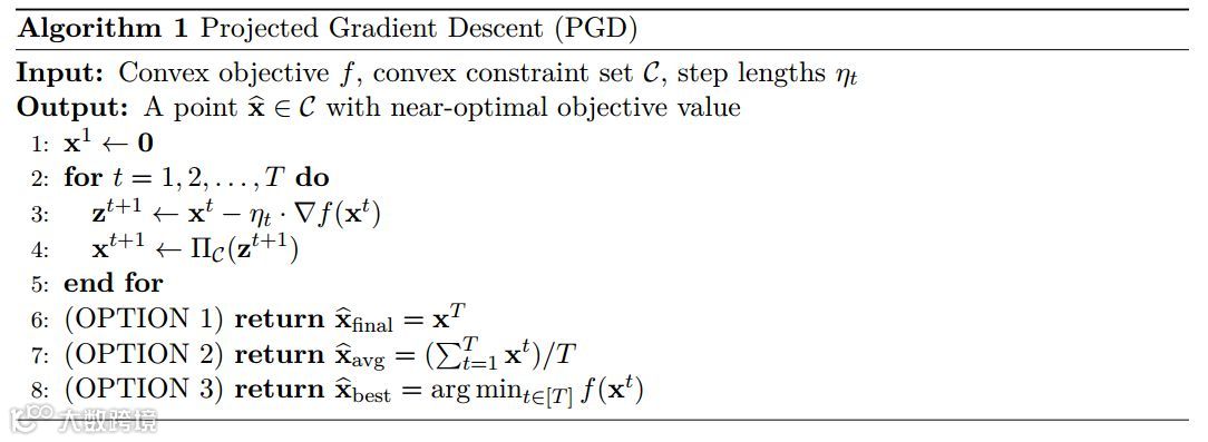 投影梯度下降算法已在算法 1 中陈述。该过程通过采取以梯度为指导的步骤生成迭代 x_t,以努力减少局部函数值。最后,它返回最后的迭代,平均迭代或者最佳的迭代。