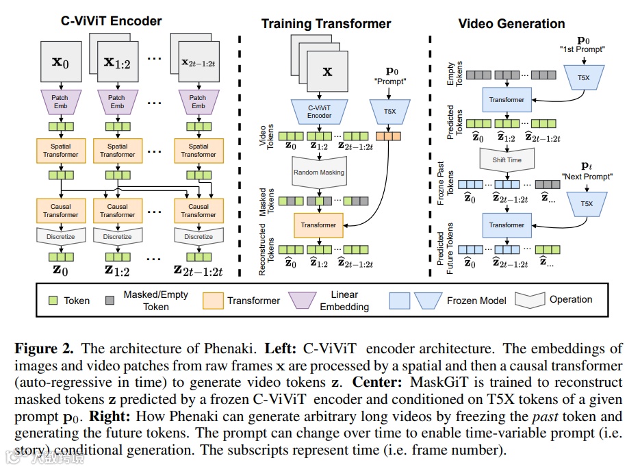 受之前自回归文本转图像、文本转视频研究的启发,Phenaki 的设计主要包含两大部分(见下图 2):一个将视频压缩为离散嵌入(即 token)的编码器 - 解码器模型和一个将文本嵌入转换为视频 token 的 transformer 模型。