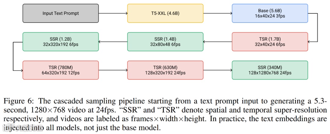 下图 6 展示了 Imagen Video 的整个级联 pipeline,包括 1 个 frozen 文本编码器、1 个基础视频扩散模型以及 3 个空间超分辨率(SSR)和 3 个时间超分辨率(TSR)模型。这七个视频扩散模型共有 116 亿参数。