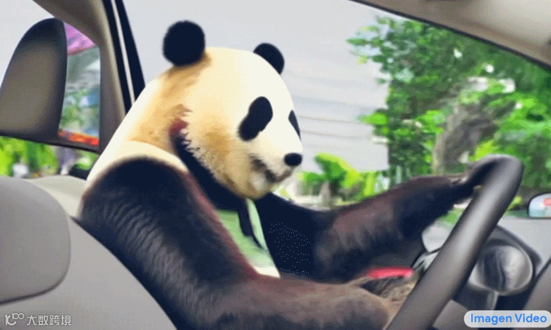 让我们再来欣赏一些 Imagen Video 生成的视频,比如开车的熊猫: