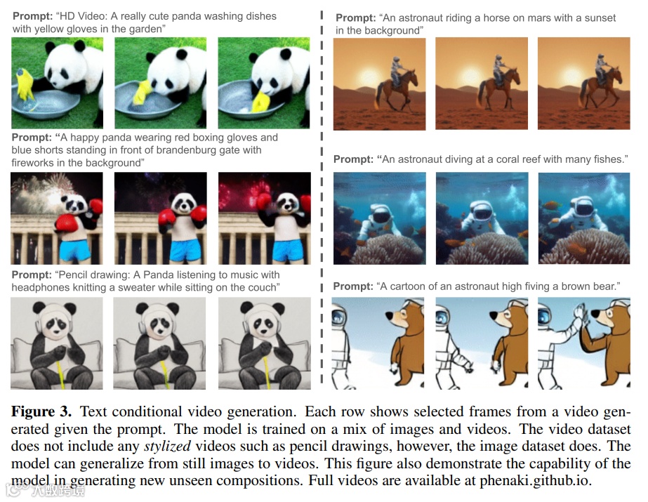 更麻烦的是,像之前那种用于图像生成的简短文本 prompt 通常不足以提供对视频的完整描述,视频需要的是一系列 prompt 或故事。理想情况下,一个视频生成模型必须能够生成任意长度的视频,并且要能根据某个时刻 t 的 prompt 变化调节生成的视频帧。只有具备这样的能力,模型生成的作品才能称之为「视频」,而不是「移动的图像」,并开启在艺术、设计和内容创作方面的现实创意应用之路。