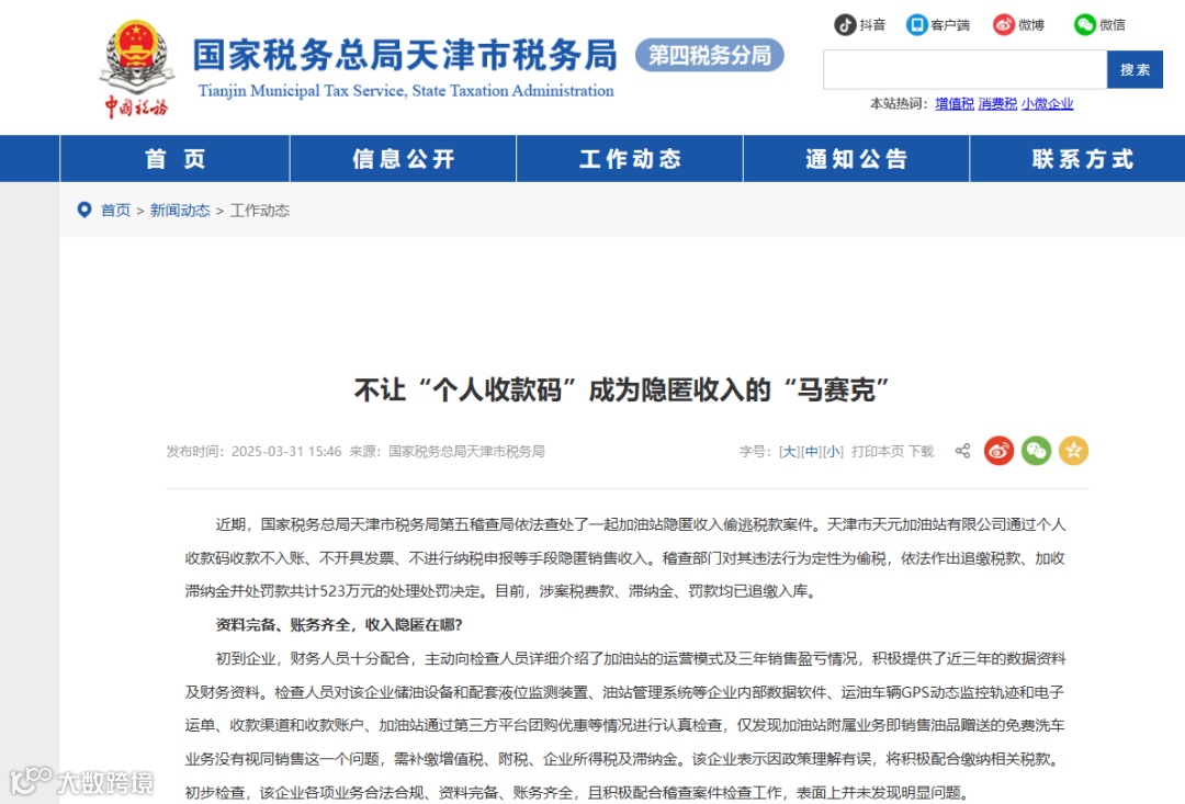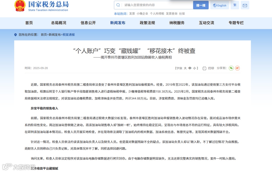 2025年9月,国家税务总局泰州市姜堰区税务局查处了一起加油站偷税案件。该加油站通过在第三方支付平台绑定个人账户收取加油款项,隐匿销售收入1085.75万元,少缴税款158.38万元,最终被追缴税费、滞纳金、罚款共计344.88万元。