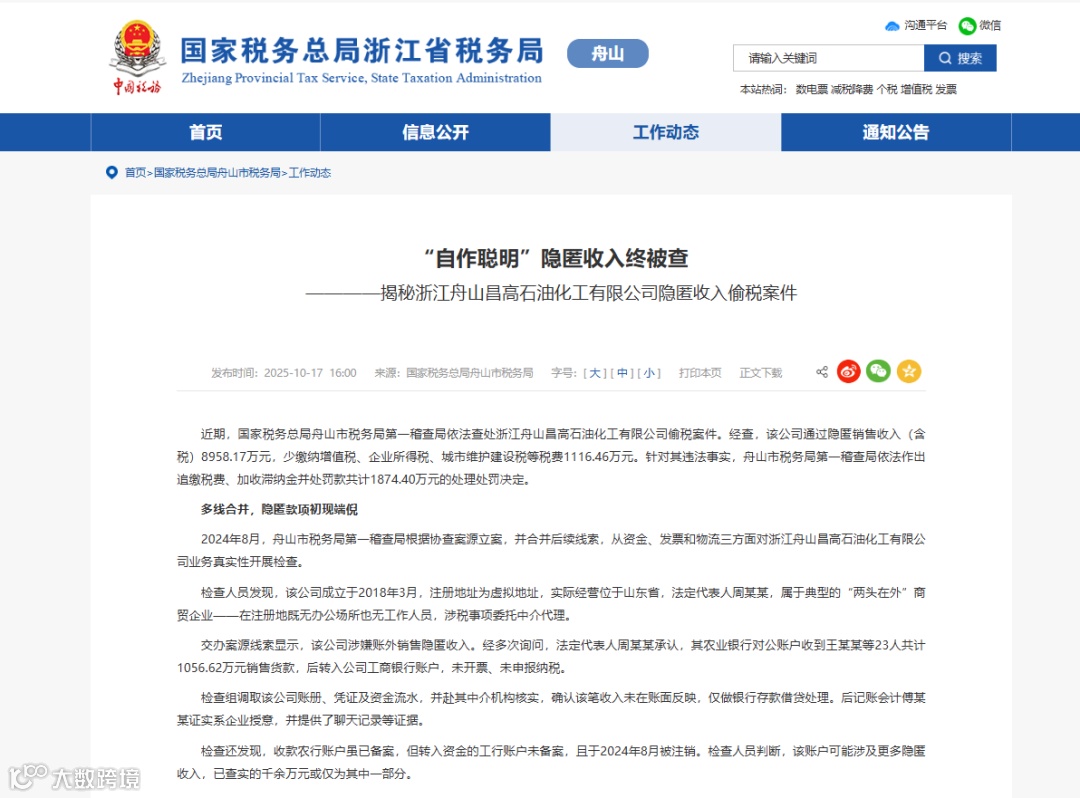 2025年10月,国家税务总局浙江省税务局通报了一起典型案例。浙江舟山昌高石油化工有限公司通过个人账户收款方式隐匿收入8958.17万元,少缴纳增值税、企业所得税、城市维护建设税等税费1116.46万元,最终被追缴税费、滞纳金、罚款共计1874.40万元。