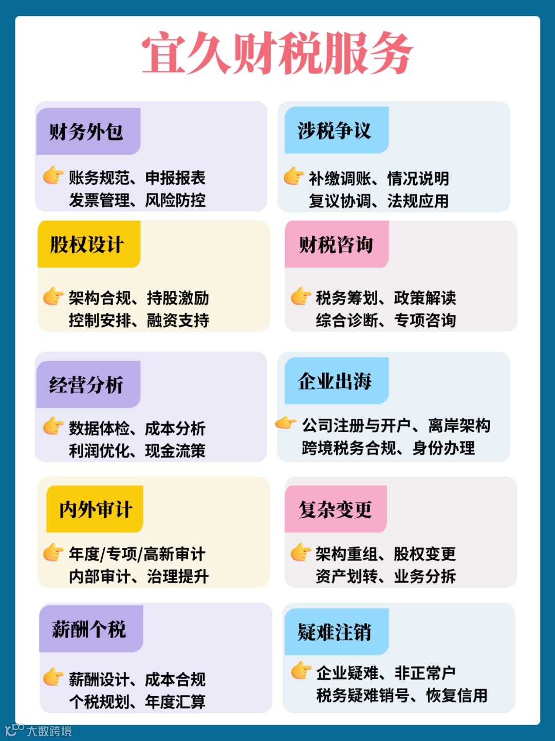 宜久财务集团业务包含:财税合规、税务规划、税务争议解决、审计评估、商业投资服务、IPO系列业务、海外移民、会计外包、人事服务、跨境投资、家族理财、法律服务等。