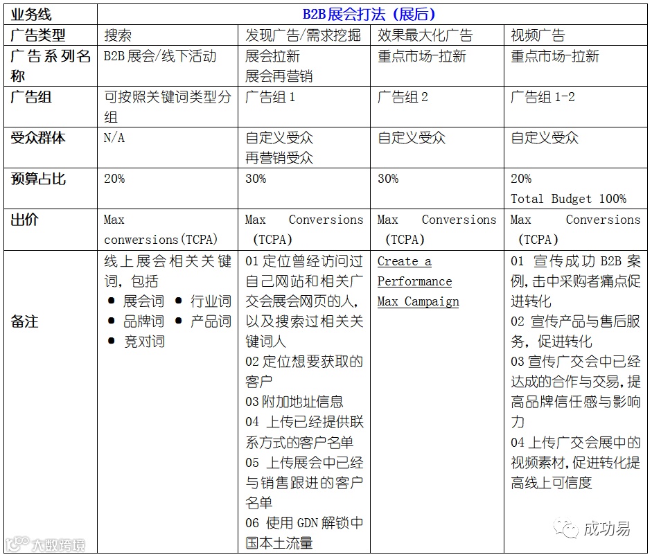 - 展后:提升主动型广告预算,扩大再营销受众名单,上传展会现场素材增强品牌信任度[k]。