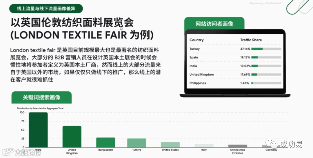 此外,以英国纺织展为例,尽管展会本地参与者为主,但线上搜索流量主要来自海外,显示线上受众与线下存在显著差异[k]。通过Google可精准覆盖这些未到场但具采购意向的国际买家,扩大潜在客户池[k]。
