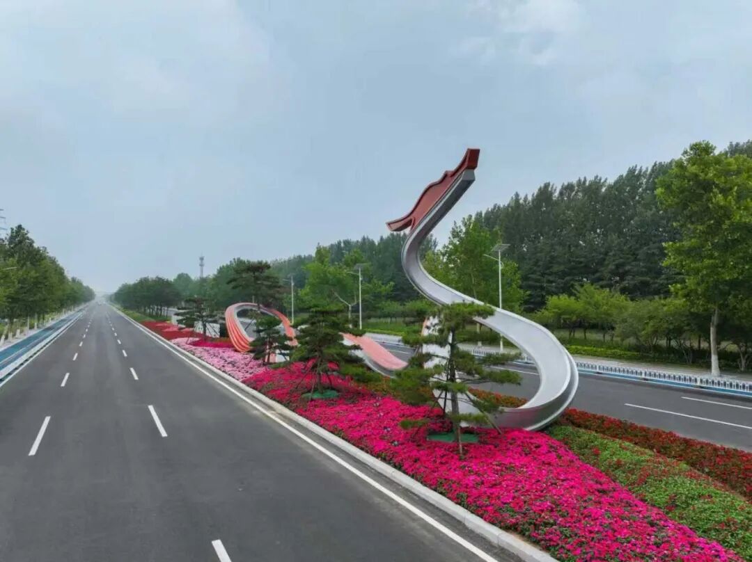 围绕“提升标准、打造亮点”的目标,项目重点打造坝南路等关键枢纽。通过对路口节点及沿线空间实施绿化改造,增设“时代之钥”主题雕塑,增强文化内涵与视觉标识。水厂侧设置的“山港之宾”景观,配以“山东港口欢迎您”自然景石,与绿化造型共同构筑出如巨船扬帆的迎宾意象,营造出简洁大气、富有工业美感的通道形象。