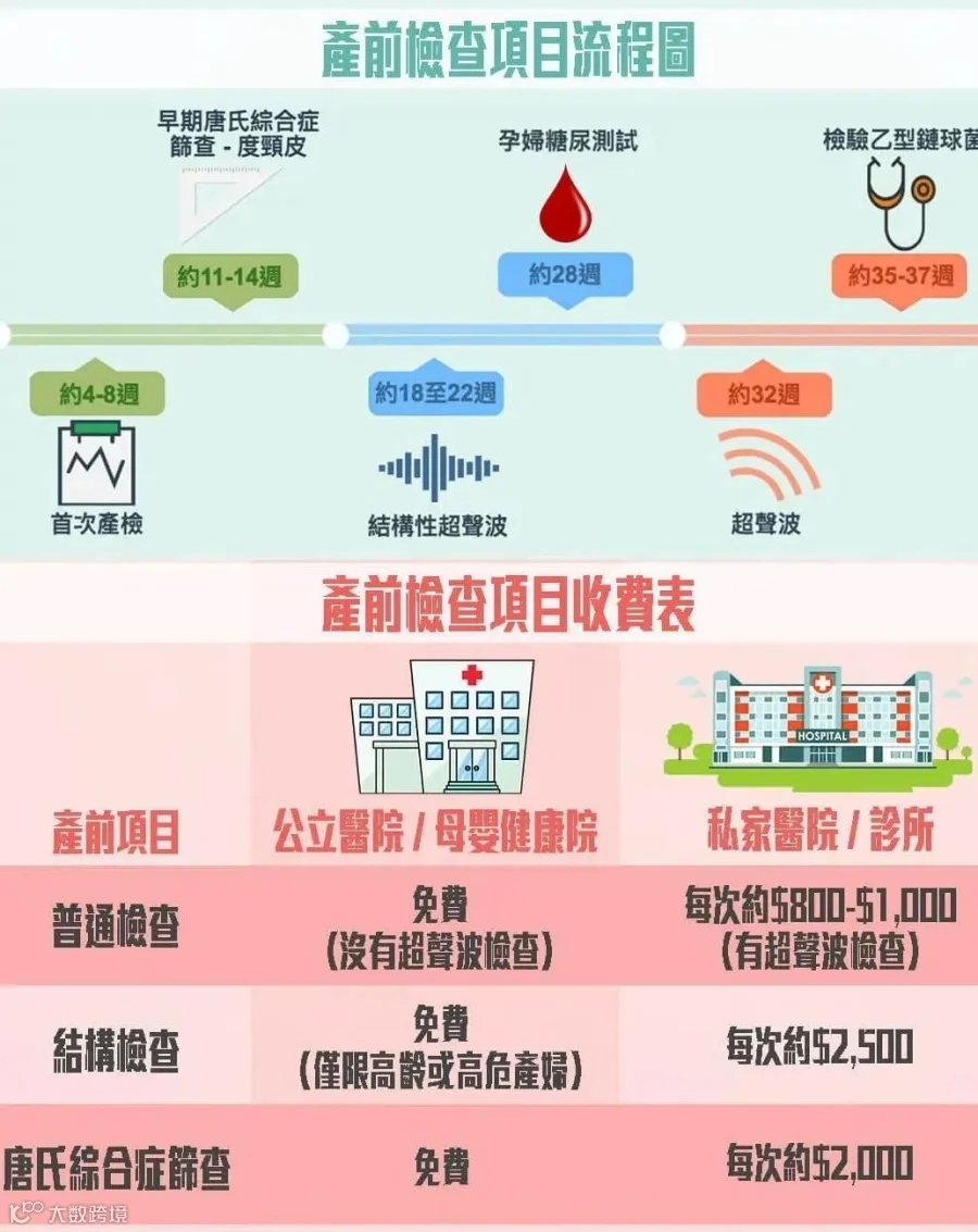 私立医院产检:产检项目丰富,涵盖常规检查和超声波检查等,每次产检费用约1200港币,需自费。