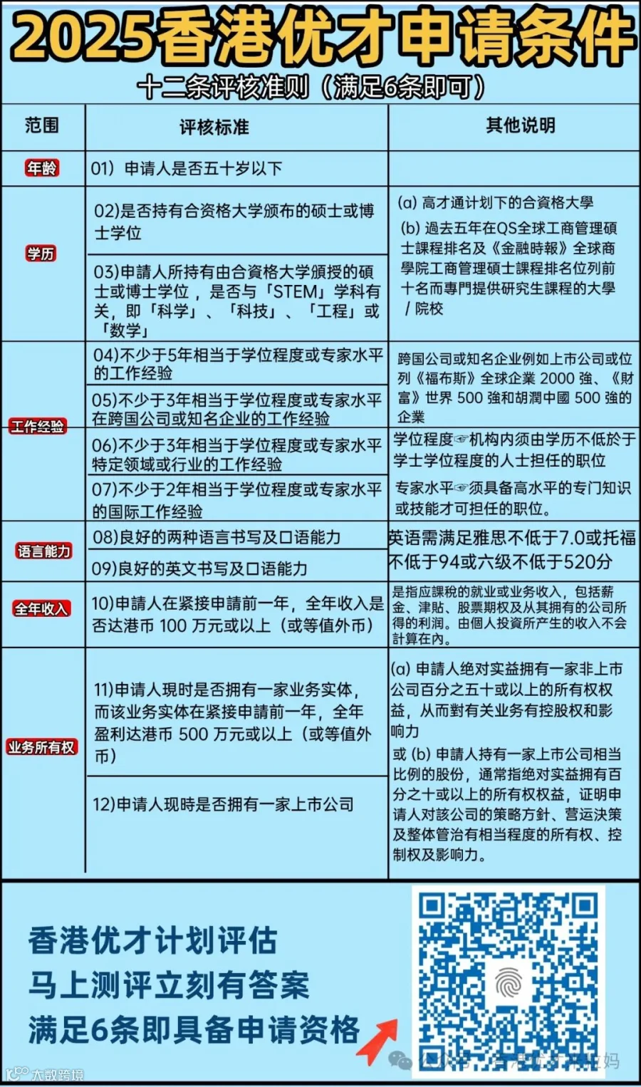 申请人可根据上表进行自我评估,确定是否满足至少6项标准,对于一些暂时未能或不明确能达到香港优才条件的申请人,建议咨询专业机构进行详细评估,或考虑通过其他途径(如香港专才计划、高才通计划等)获取香港身份。