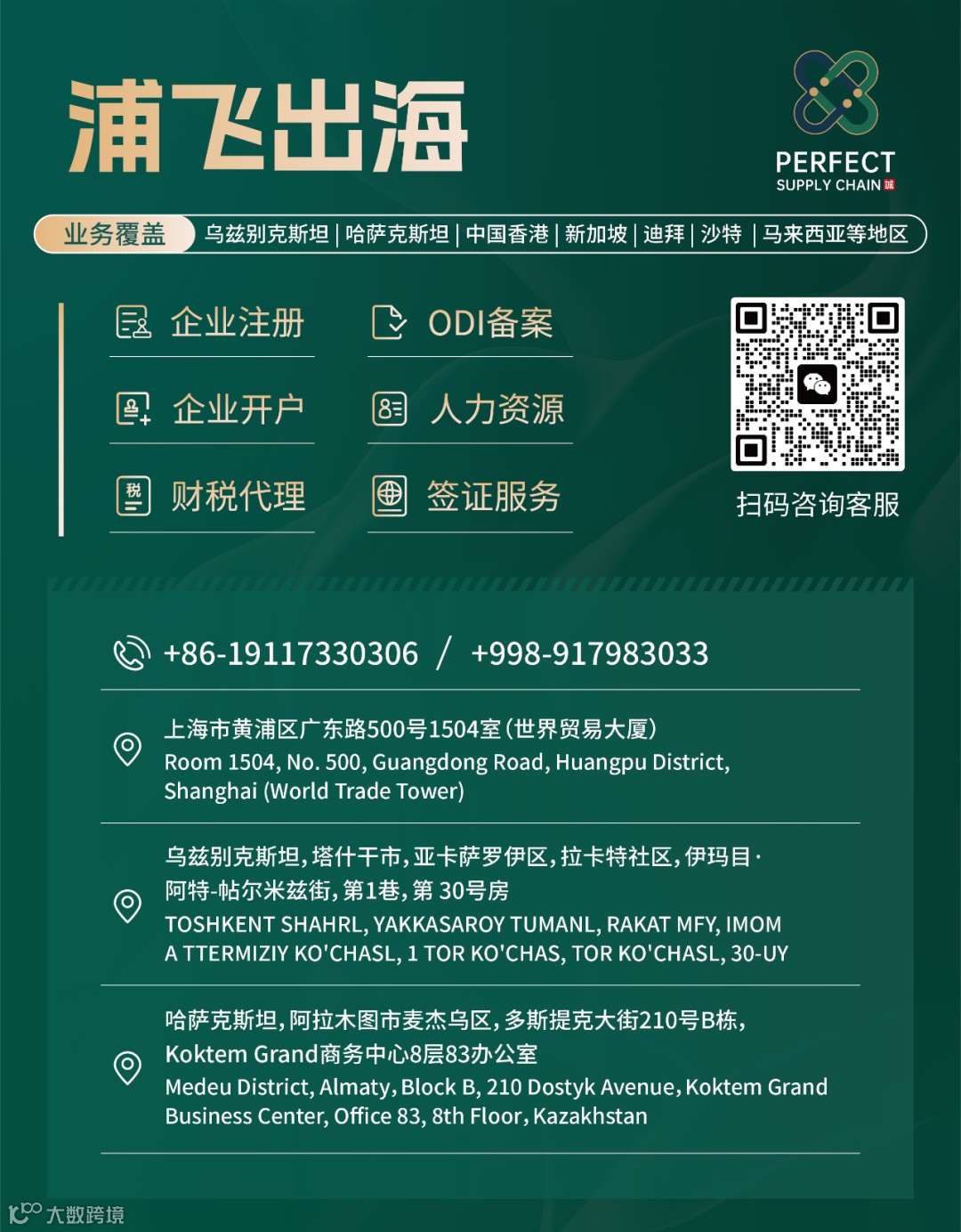 专注中企出海,25年中外企服经验,业务覆盖乌兹别克斯坦、哈萨克斯坦、吉尔吉斯斯坦、俄罗斯、香港、新加坡、泰国、开曼、塞舌尔、BVI、韩国、马来西亚、越南、迪拜……全球众多知名企业合作伙伴,助您的企业出海之行一帆风顺。