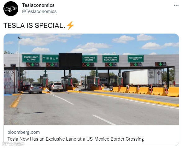 为加快供应商将零部件和原材料从墨西哥新莱昂州运输到美国得克萨斯州的速度,新莱昂州建立了特斯拉供应商专用的过境车道