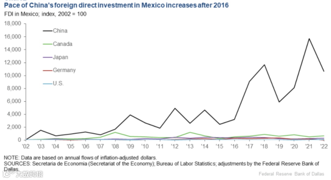 美国达拉斯联储研究报告显示,中国在墨西哥的直接投资份额在近几年迅速上升,流入墨西哥的外商直接投资从2011年的3800万美元,增长到2021年的3.86亿美元,是墨西哥增长最快的外国投资来源国。