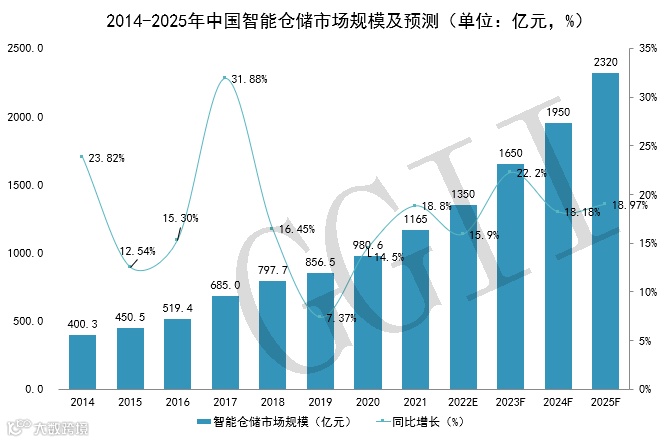 高工机器人产业研究所(GGII)数据显示,2021年,中国智能仓储市场规模1165亿元,同比增长18.8%,同时GGII预测,到2025年,中国智能仓储市场规模将达2320亿元。