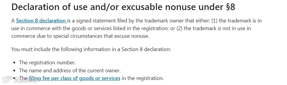 依据美国商标法第8条的要求,注册人在注册后的第5 - 6年要进行使用宣誓,而且得向美国专利商标局呈交一份宣誓书,用以证实该商标在过去5年已用于商业活动,并且还有继续使用该商标的意愿。
