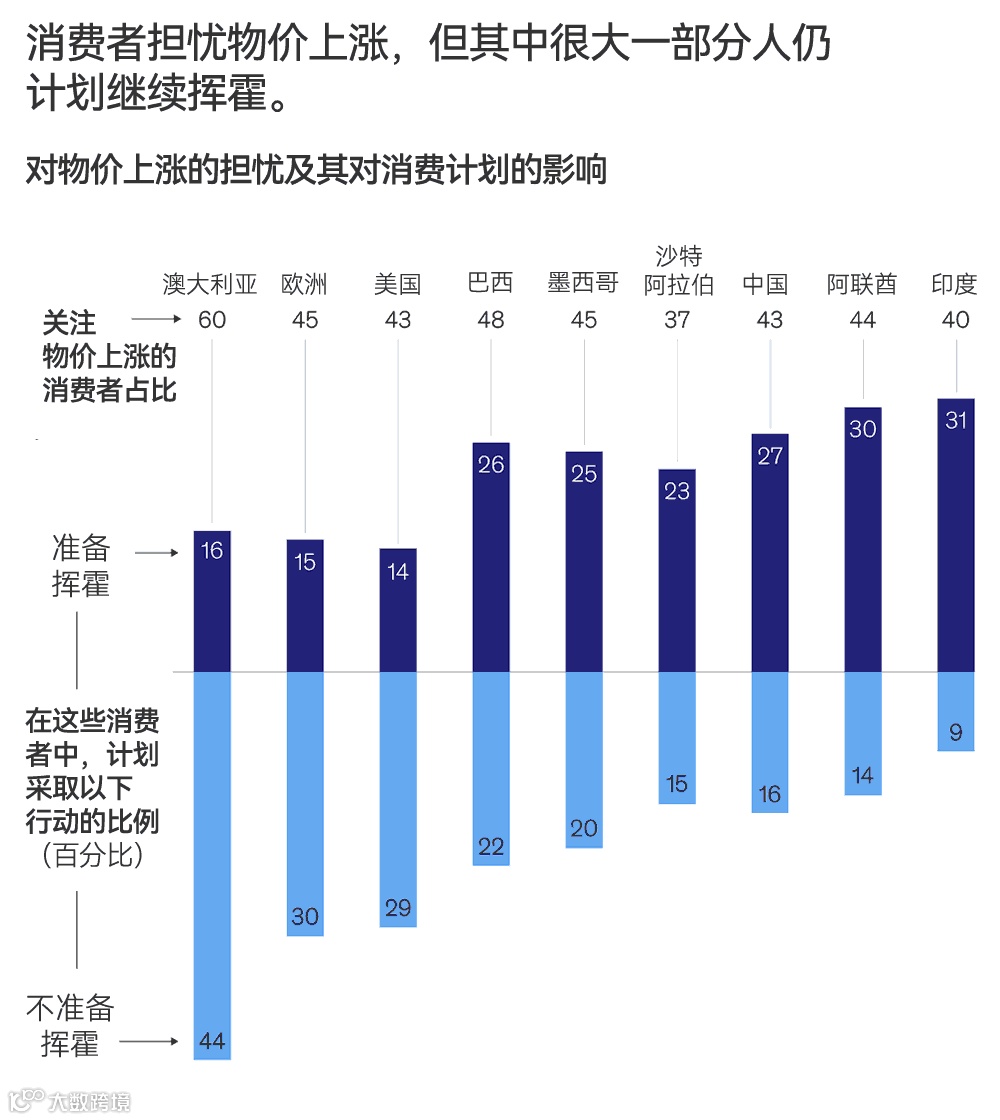 部分消费者不愿放弃新冠疫情期间养成的消费习惯。即便在表示担忧物价上涨的消费者中,仍有超过三分之一计划继续大手笔消费。这种现象遍布各大区域,尤以巴西、中国和阿联酋最为显著。