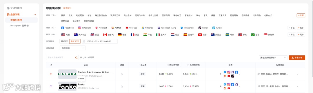 1. 中国运动健身品牌崛起:Halara 与 Fanka 独立站广告投放量领跑