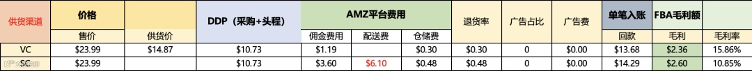 由于VC为B2B模式,其利润核算方式与SC不同。收入基于供货价而非最终售价,通常供货价约为市场售价的65%。相比SC需支付FBA尾程费用和类目佣金,VC主要承担海外仓仓储费、订单处理费及账户条款佣金(DA)。广告、优惠券等营销成本由卖家承担,若使用Coupon或Deals促销,差额将从供货价中扣除[k]。