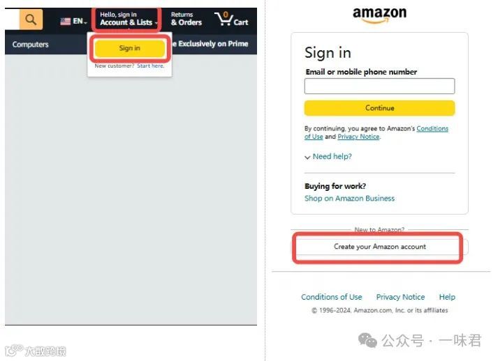 1. 进入亚马逊网站,点击“登录”或“注册账号”;