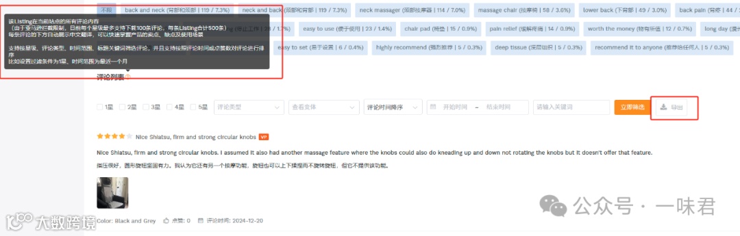 导出的评论数据包含该Listing在当前站点的所有评论(受限于平台规则,每个星级最多下载100条,合计最多500条)。实测数据可超过此限制。为确保代表性,建议优先分析近期评论,以反映最新产品版本的用户反馈[k]。