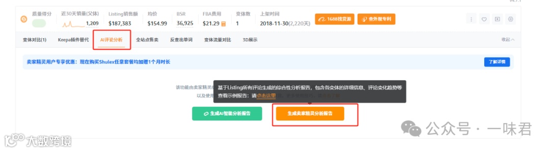 使用卖家精灵插件的AI评论分析功能,生成详细报告,包含消费者画像、使用场景及未满足需求点。报告可导出完整评论内容,数据更具代表性[k]。