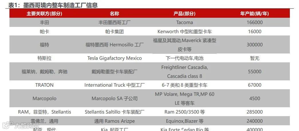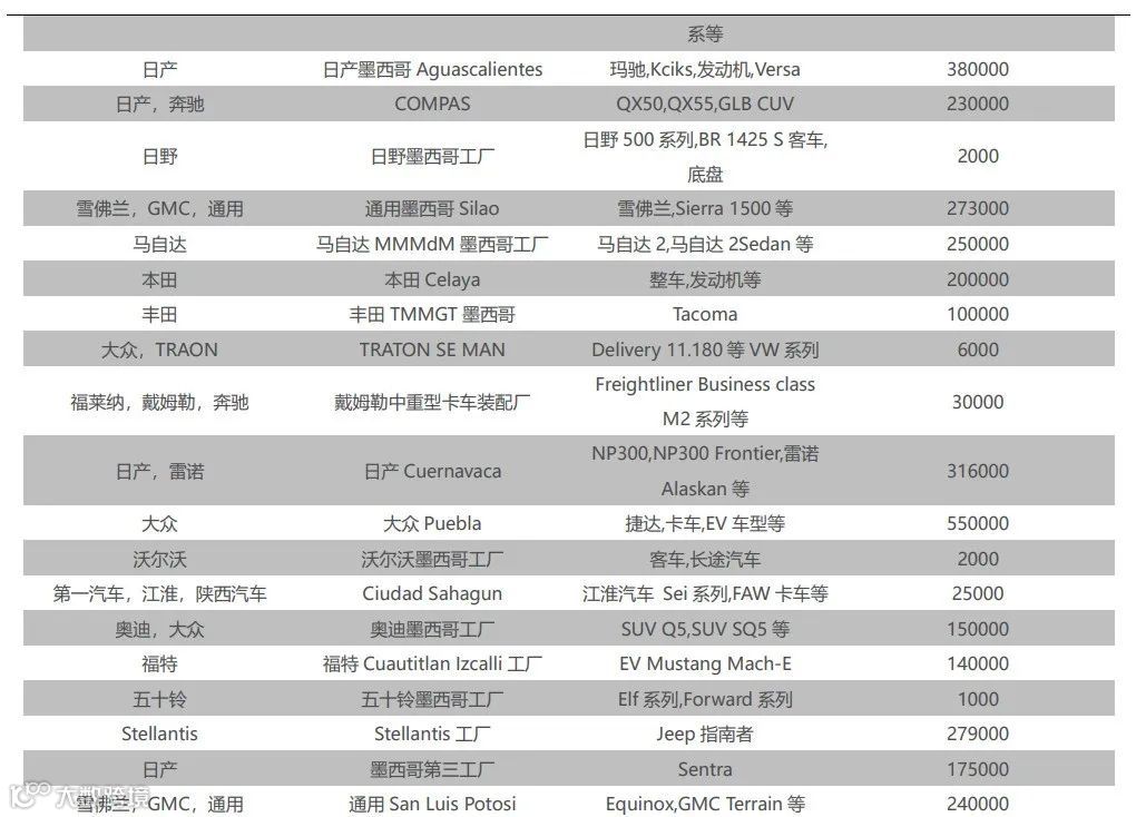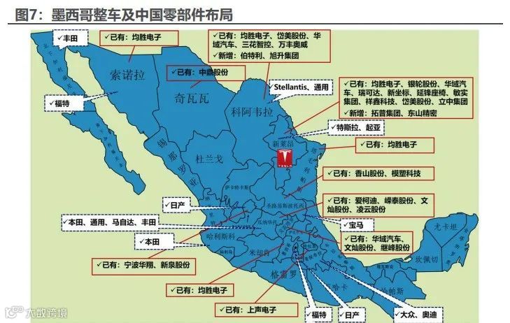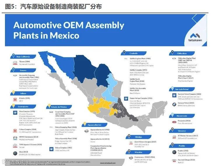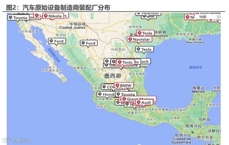 依托于其低廉的人力成本、优越的地理位置和与各国签订的贸易协定,墨西哥成功地吸引了包括日产,宝马,大众等许多国际汽车制造商在其境内设立生产基地。墨西哥吸引的外资整车制造商地理位置较为集中,主要分布在墨西哥城,普埃布拉州首府,瓜纳华托州首府,阿瓜斯卡连特斯州首府,新萊昂州首府蒙特雷,美墨边境的下加利福尼亚等地,大部分位于区域经济中心,交通发达。在整个分布中,以蒙特雷和首都墨西哥城附近的整车厂集群最为密集,特斯拉用于生产新一代电动车和电池的整车厂也将坐落于蒙特雷。