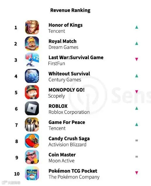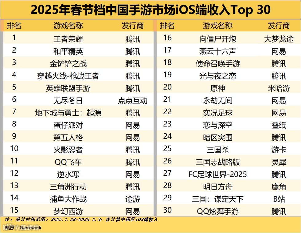 除《王者荣耀》外,多款腾讯系手游在这个春节假期迎来了流水起飞,《和平精英》和《穿越火线》1月全球收入分别激增267%和421%。《金铲铲之战》与《地下城与勇士:起源》(DNF手游)虽受同期其他游戏影响,流水较去年12月出现下滑,但仍牢牢占据2025年1月份手游收入榜前排。另外根据游戏媒体Gamelook统计,今年春季期间,中国手游市场iOS端收入Top10,腾讯系手游占七席且屠榜前五。