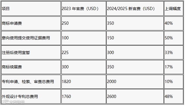 需要注意的是,这些费用调整将影响到商标和专利申请等主要项目的官费,更多详细信息可以在相关官方网站上查看:https://www.uspto.gov/learning-and-resources/fees-and-payment/uspto-fee-schedule#Trademark%20Fee
