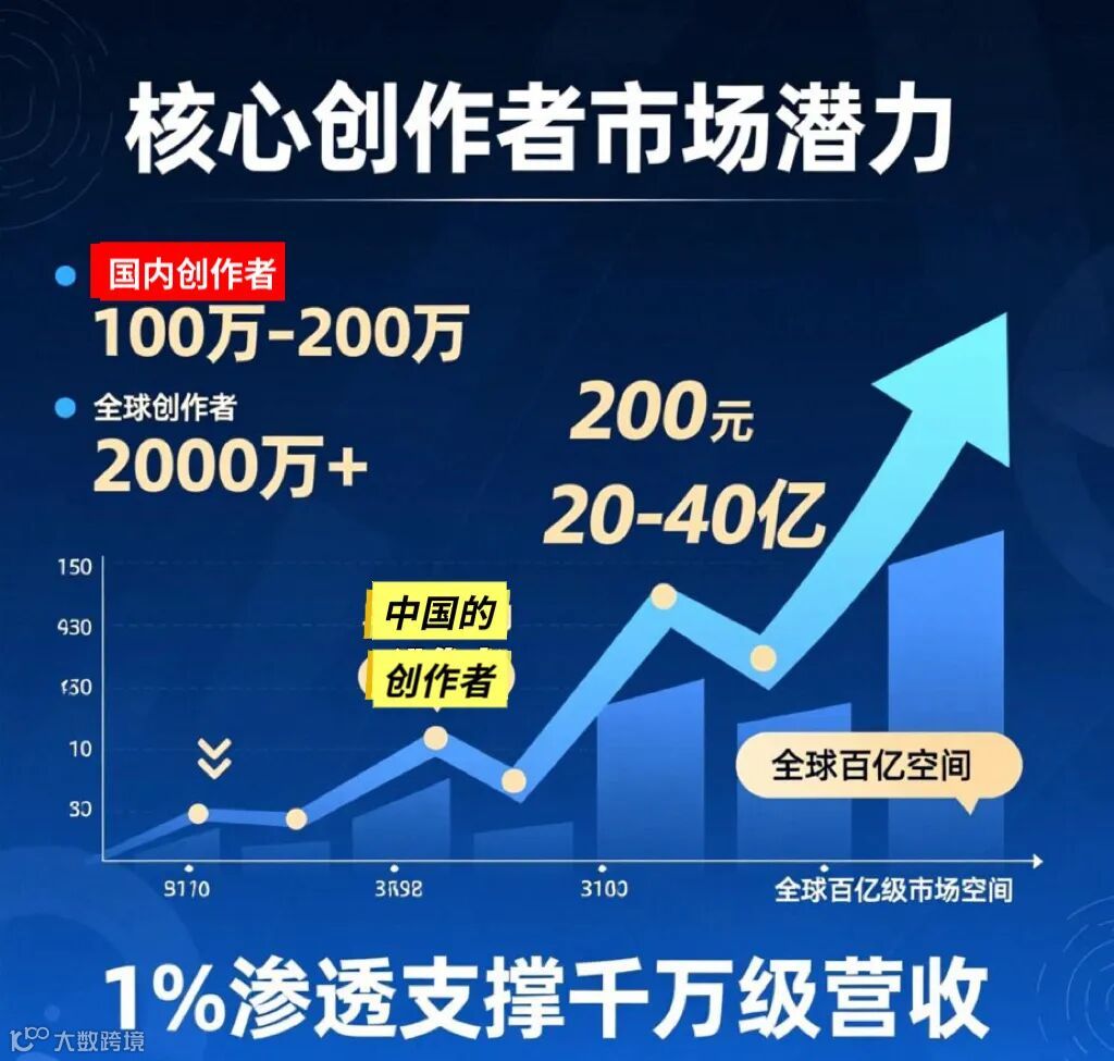 核心创作者(约1%-2%):国内约 100万 - 200 万人,全球约 2000 万+ -