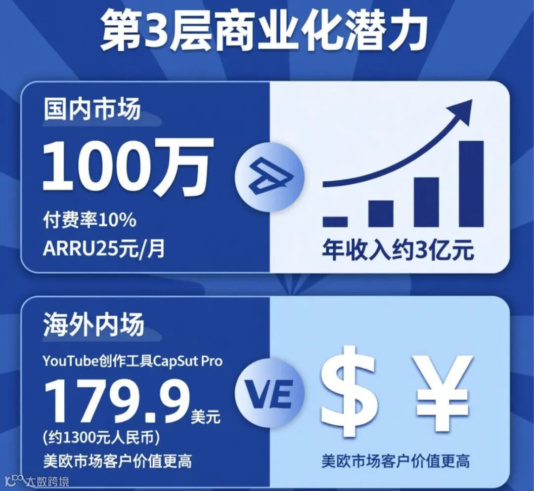YouTube 创作工具,CapCut Pro 年费约 $179.9美元,约合人民币1300元左右,美欧市场单个客户价值更高 -