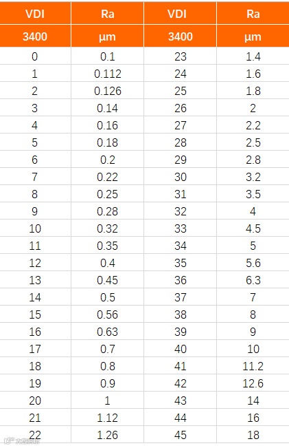 在国内实际生产中多用Ra指标;日本常用Rmax指标,相当于Rz指标;欧美国家常用VDI3400标准来标示表面粗糙度,做欧洲模具订单的工厂,经常会用到VDI指标,比如常听到客户说“这个产品的表面按VDI30做”。