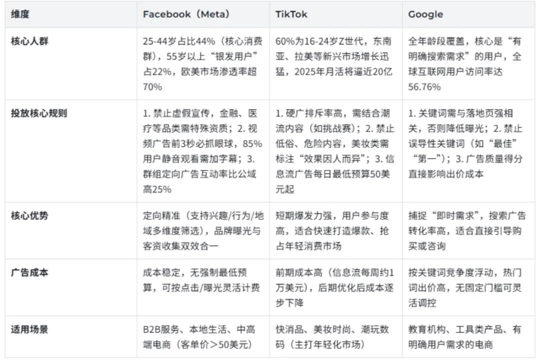 三大平台的底层逻辑截然不同:Facebook靠社交关系触达潜在用户,TikTok靠算法捕捉潮流流量,Google靠搜索需求锁定精准客户。以下6大维度的对比,能帮你快速匹配自身业务需求
