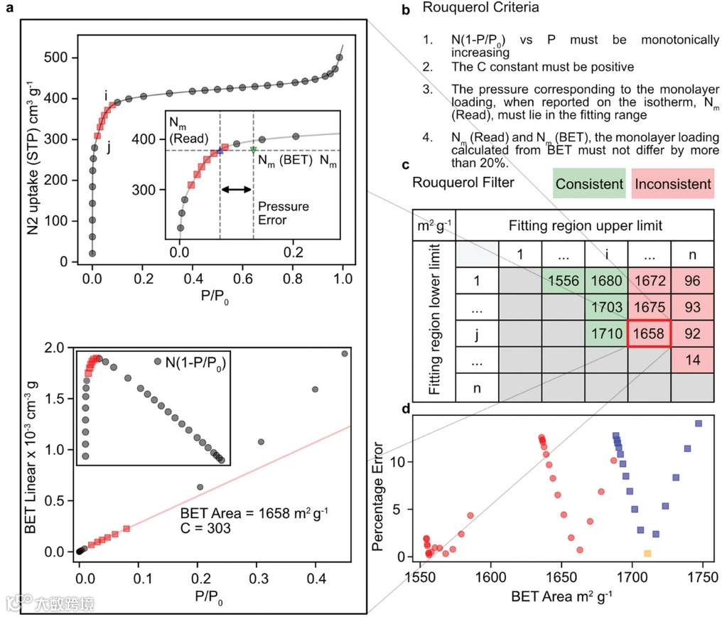 虽然Rouquerol 标准有助于确定有效拟合范围,并已被 IUPAC 和 ISO 标准采用。尽管如此,剑桥大学化学工程与生物技术系吸附与先进材料实验室David Fairen-Jimenez教授等人仍然指出:当前的 BET 面积计算缺乏可重复性。主要原因有两个:首先,Rouquerol标准在识别正确的拟合区域时不确定,因为它们同时适用于多个区域;其次,即使是确定的,但实施起来过于繁琐和冗长,在实践中经常被忽视,也无法系统且明确地计算。