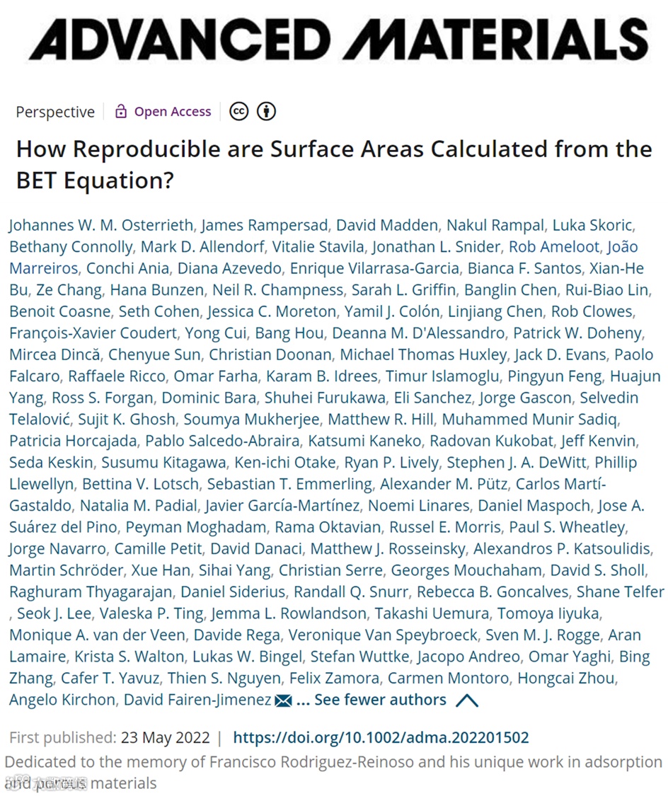 上述研究成果以题为“How Reproducible are Surface Areas Calculated from the BET Equation? ”,以“Perspective”形式发表在《Adv. Mater.》上。剑桥大学化学工程与生物技术系吸附与先进材料实验室David Fairen-Jimenez教授为文章的通讯作者。
