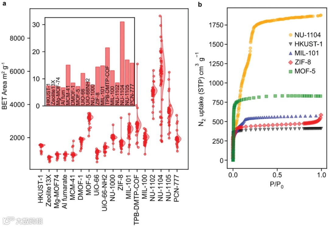 结果表明,每个等温线至少有 300 m2 g-1 的扩散;然而,对于某些单独的等温线,这个数字要高得多。例如NU-1104(等温线图 1b)样品的最高估计值 (9341 m2 g-1 )居然是最低估计值(1757 m2 g-1)的五倍,相差惊人的 7584 m2 g-1!!!