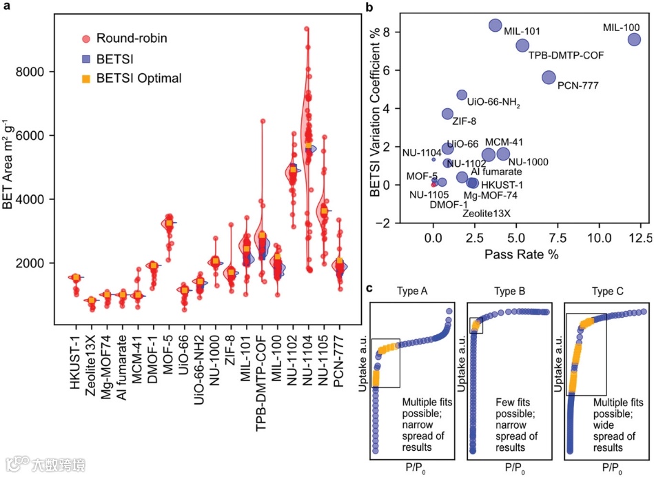 图1. BET 面积计算的循环结果:(a)由61个具有吸附科学和多孔材料合成专业知识的实验室计算得出的相同等温线BET区域分布。 叠加的是通过核密度估计获得的归一化概率分布函数(每种材料的样本大小,n = 61)。 插图显示了每种材料结果的变异系数,即相对标准偏差)。 (b)对应材料的示例性等温线。新的BET分析工具---BETSI,计算误差缩小30余倍!