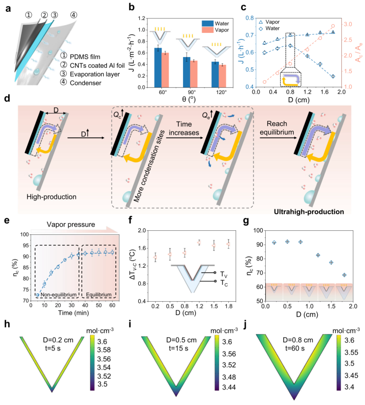 图2:单级结构的配置与参数优化 a. 单级结构的组成与材料示意图。 b. 不同锥角下单级结构的产水性能。 c. 不同传质间隙下的蒸汽与水产量,插图为系统达到超高生产平衡的点。 d. 传质间隙增大提升水产量的机制图,展示蒸发能力与冷凝能力的变化关系。 e. 传质间隙为8毫米时,单级结构在不同时间段的蒸汽-水转换效率。 f. 不同传质间隙下蒸汽与冷凝表面的温差。 g. 不同传质间隙下的蒸汽-水转换效率。 h-j. 通过模拟软件展示不同传质间隙下腔室内蒸汽浓度分布的演变过程。