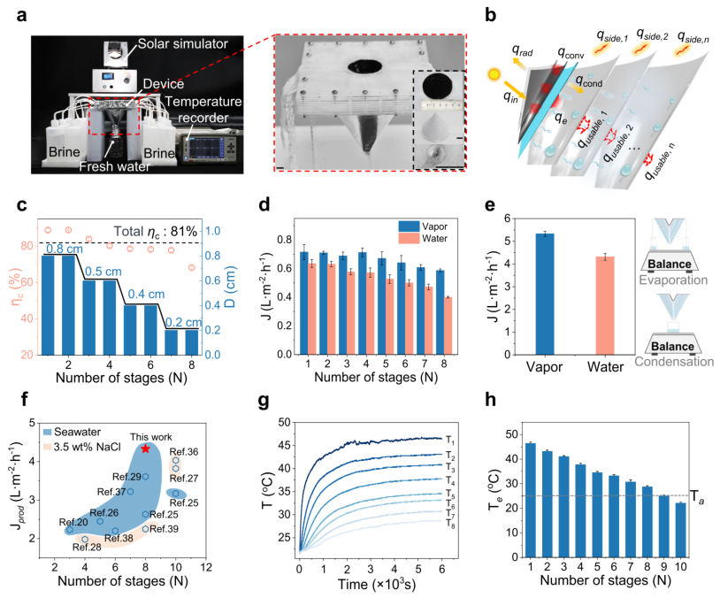 图3:不对称锥形八级太阳能蒸馏器的配置与性能 a. 实验用八级设备实物图,开口直径5厘米。 b. 八级设备的热传递过程示意图。 c. 每级的蒸汽-水转换效率与传质间隙设置。 d. 每级的蒸汽与水产量分布。 e. 设备的总蒸汽与水产量。 f. 与已有文献中多级系统水产量的对比。 g. 优化后八级设备各阶段的温度分布。 h. 十级结构中各阶段的蒸发温度,显示后级温度接近环境温度。
