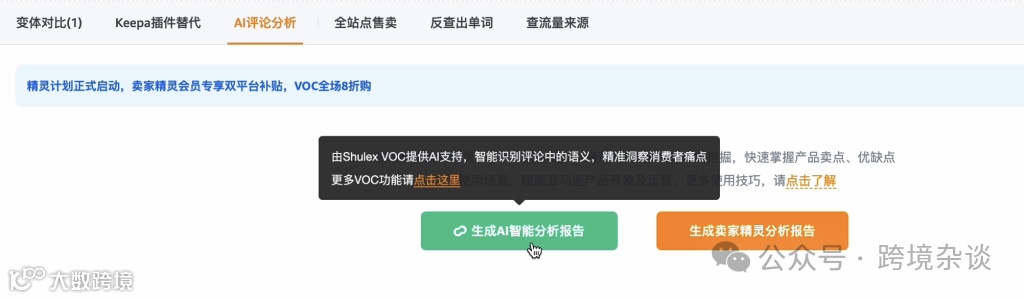 这样基本就完成了选品的初步判断。当然你还要注意避免侵权,并做出差异化,最直接的方法就是在买家评论中找到产品存在的痛点,进入listing详情页,安装好卖家精灵插件后点击顶部“AI评论分析”栏里的生成AI智能分析报告,耐心等待处理完,再点右边“去卖家精灵查看分析”,就能查看该产品的消费者画像、使用场景、购买动机等重要指标。