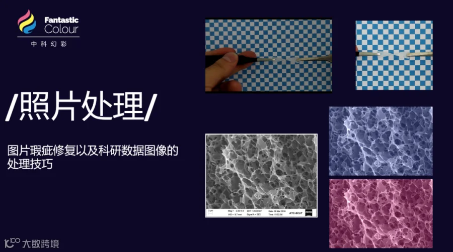 ▲照片类图像数据的色彩校正深入分析讲解:图像剪裁、颜色匹配、颜色通道合成、明暗对比优化、电镜伪彩上色、黑场白场中性灰场等图像的理论知识,详解多图像排版等;